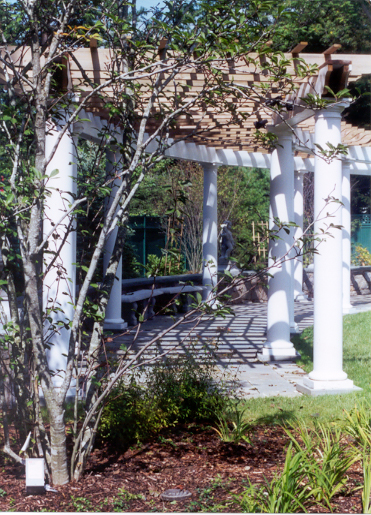A master plan was developed to enhance the sites physical appearance as well as provide better functionality of the user’s spaces.  Upon the owners request an English garden theme was developed incorporating a new pergola, which accentuates the allee of pears trees.   A lion’s head fountain was added to the project to provide a strong connection form the kitchen to the landscape.  A magnificent fountain was established to anchor the cross access.