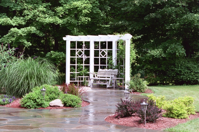 This charming 5-acre property nestled in the woodlands of The New York City reservoir systems in the Town of Katonah, New York provides an opportunity to create outdoor spaces that allow the users to take advantage of the beautiful natural countryside surroundings.  A series of stone patios, bluestone steps, stone walkways, a water feature and naturalistic planting were incorporated into the overall master plan of this property to provide pleasing viewing and sitting areas for the homeowners and their guests.  A naturalistic stone fountain and a white washed cedar pergola were used to create a point of interest as well as an area of refuge.  The owners have enjoyed many days and evenings entertaining amongst their very naturalistic English style garden.